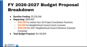 - Securing Election Outreach Funding: We are requesting dedicated funds now to ensure high participation in the 2027 Neighborhood Council Elections.