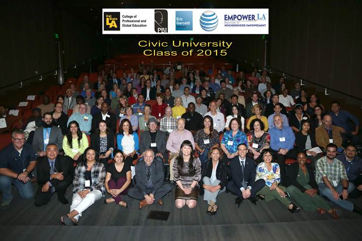 Part of Mayor Garcetti’s vision for empowering Angelenos came to a wonderful conclusion on Wednesday night as the first (and hopefully one of many) Neighborhood Council Civic University class graduated with over 100 students from Neighborhood Councils across the city. This was a first time collaboration by Mayor Garcetti’s Office, the Pat Brown Institute of Cal State Los Angeles, the Board of Neighborhood Commissioners and our Department of Neighborhood Empowerment, and I can say it was a huge success. Raphael Sonenshein, the Executive Director of the Pat Brown Institute, received a well deserved standing ovation from the students for his insightful and witty lectures over the course of 3 nights. Graduates received their certificates of completion and mingled at a reception afterwards where everyone was talking about how all Neighborhood Council members should take the class as well as when the next “masters level” class would be. We’re hoping to continue this collaboration with more classes in the near future.