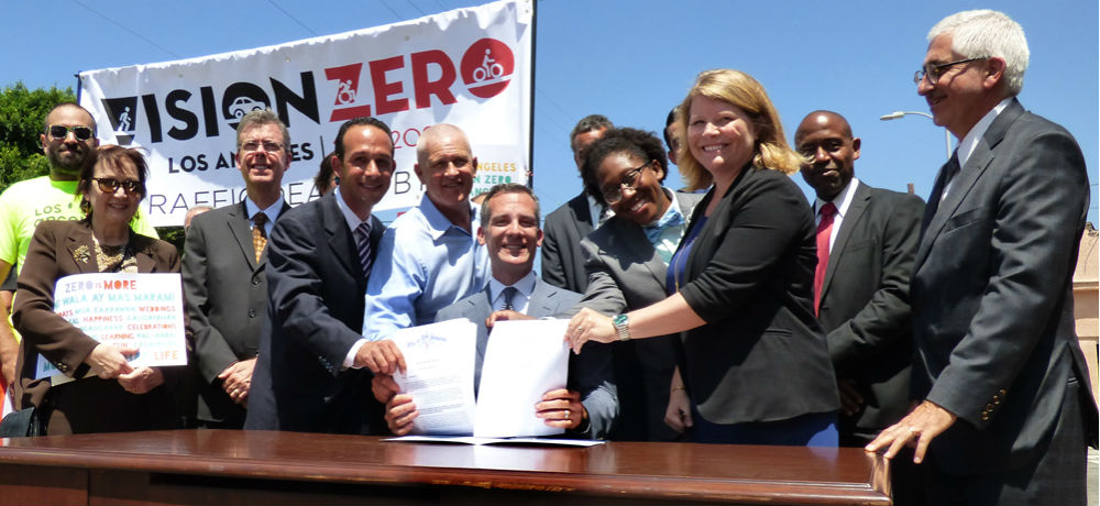 To achieve the directive’s goals, the Mayor is establishing a Vision Zero Steering Committee and Task Force and calling for actions including: an in-depth analysis by LADOT of crash profiles, types of collisions occurring, and possible countermeasures; a plan by BSS to incorporate Vision Zero strategies into major restriping and crosswalk projects; prioritized lighting projects; enhanced crash site data collection; annual walking and bicycle counts; a Pedestrian Safety Action Plan.