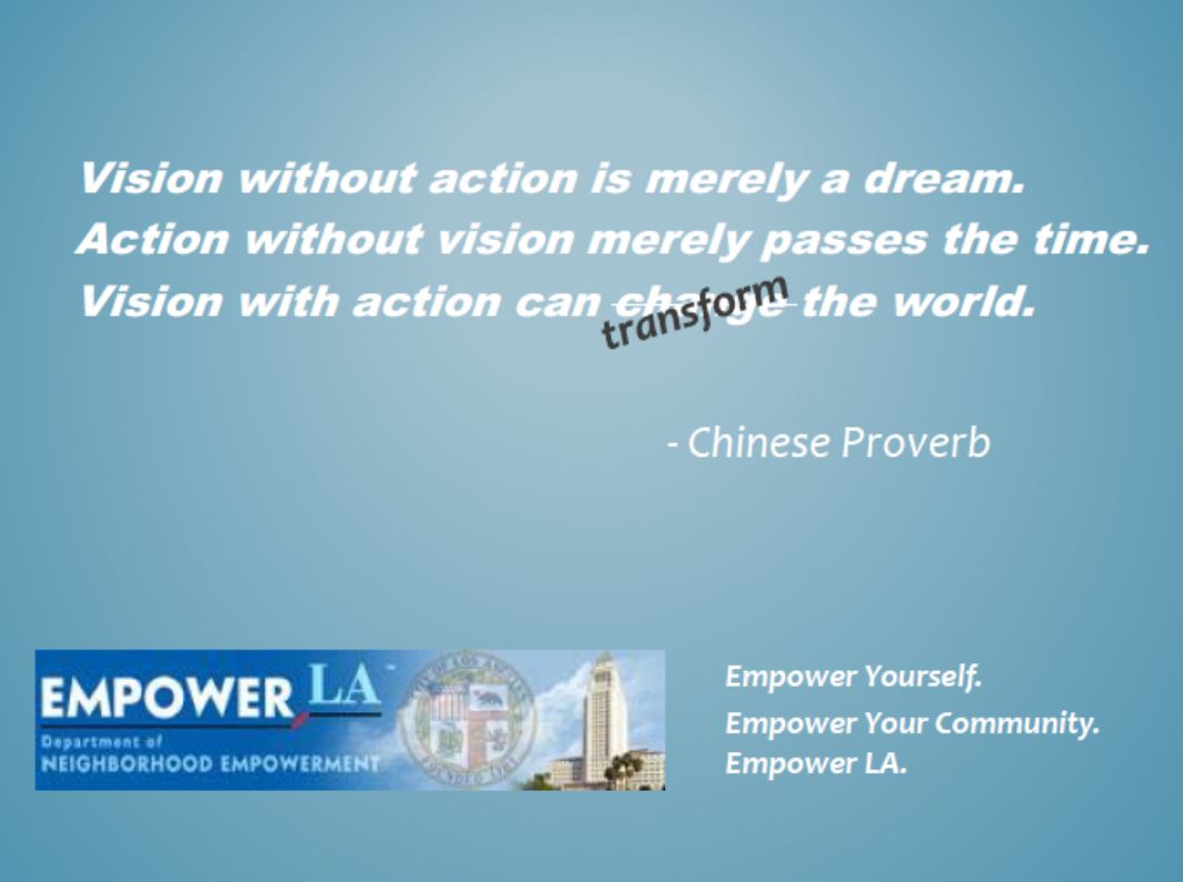 I prepared ten slides and called it: The Power of Neighborhood Councils to Transform the City of Los Angeles. These slides were just visuals focused on 2 things: Neighborhood Council Community Impact Statements and Outreach wrapped in the difference between “change” and “transformation.”