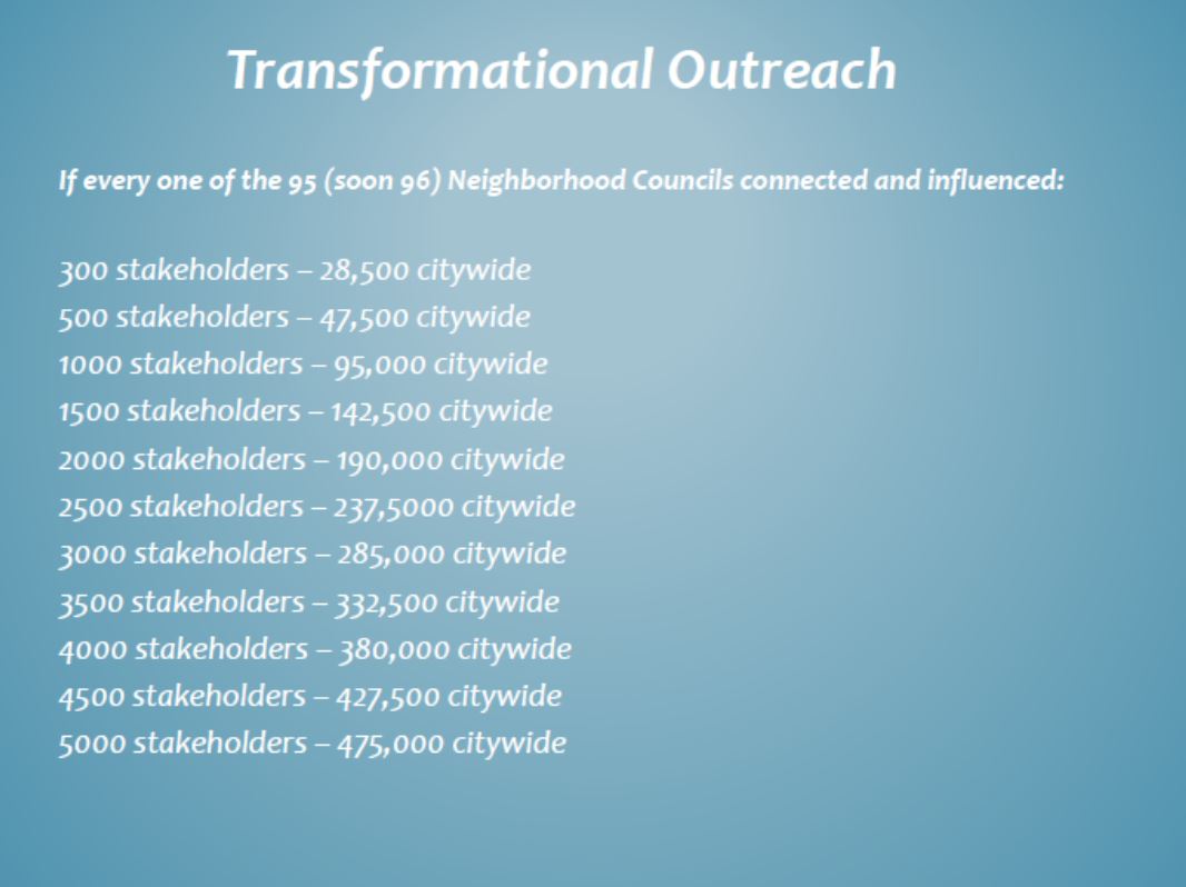 Now, let’s start dreaming about Neighborhood Council outreach. With many Neighborhood Councils having a stakeholder database of 300-500 people, what would transformational outreach look like instead?