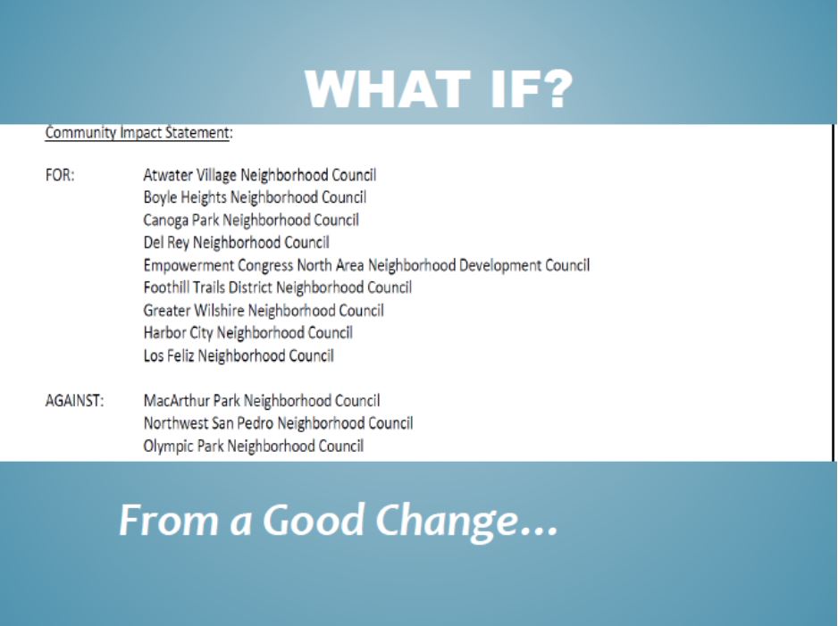 So come dream with me now. What if some Neighborhood Councils filed Community Impact Statements on this item, and it looked like this?