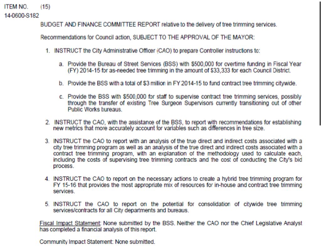 While some items were requests for reports that didn’t need a Community Impact Statement, here’s a budget item on tree trimming that affects every part of the City, but there were no Community Impact Statements filed by Neighborhood Councils.