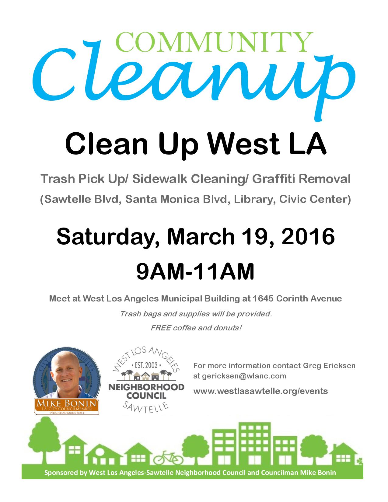 Come join us on March 19 from 9AM to 11AM to cleanup our neighborhood. We will be picking up trash on Sawtelle Boulevard and Santa Monica Boulevard along with cleaning up the areas around the West Los Angeles Regional Library, the civic center, and senior center. We will also be reporting graffiti and bulk item pickup to MyLA311 for cleanup.